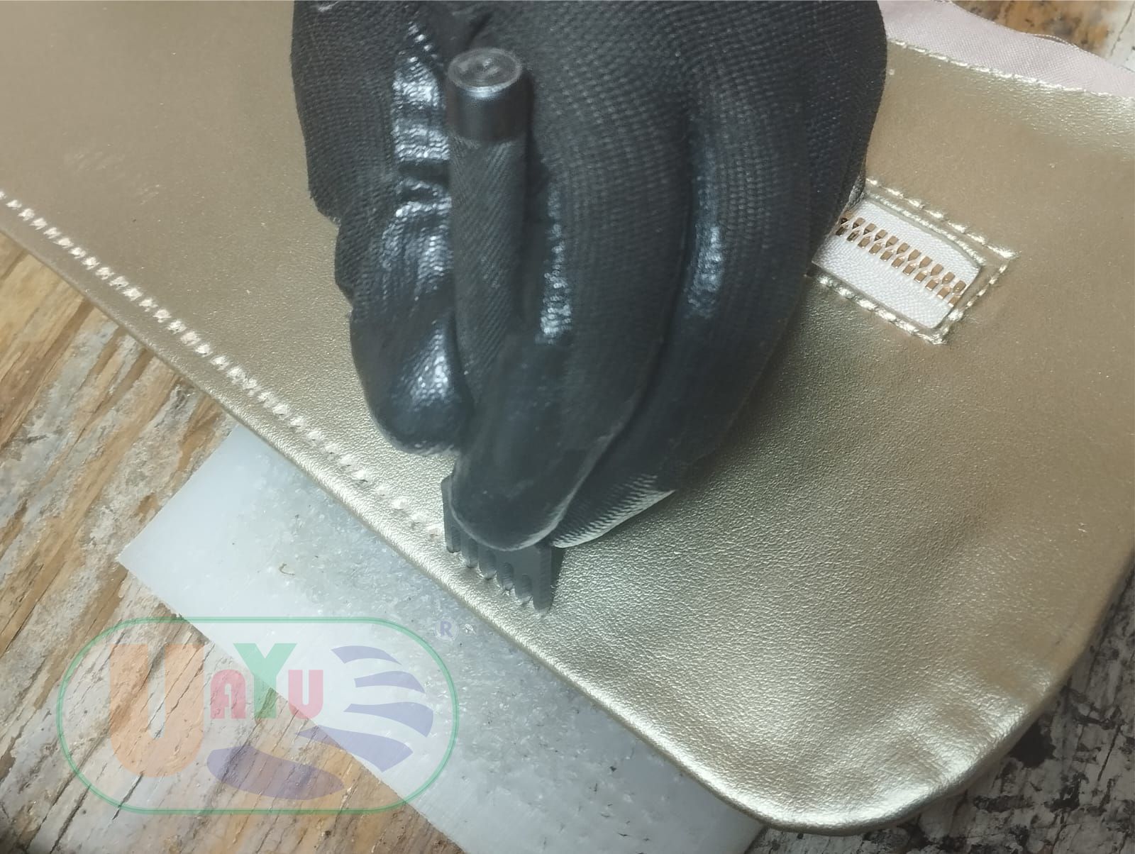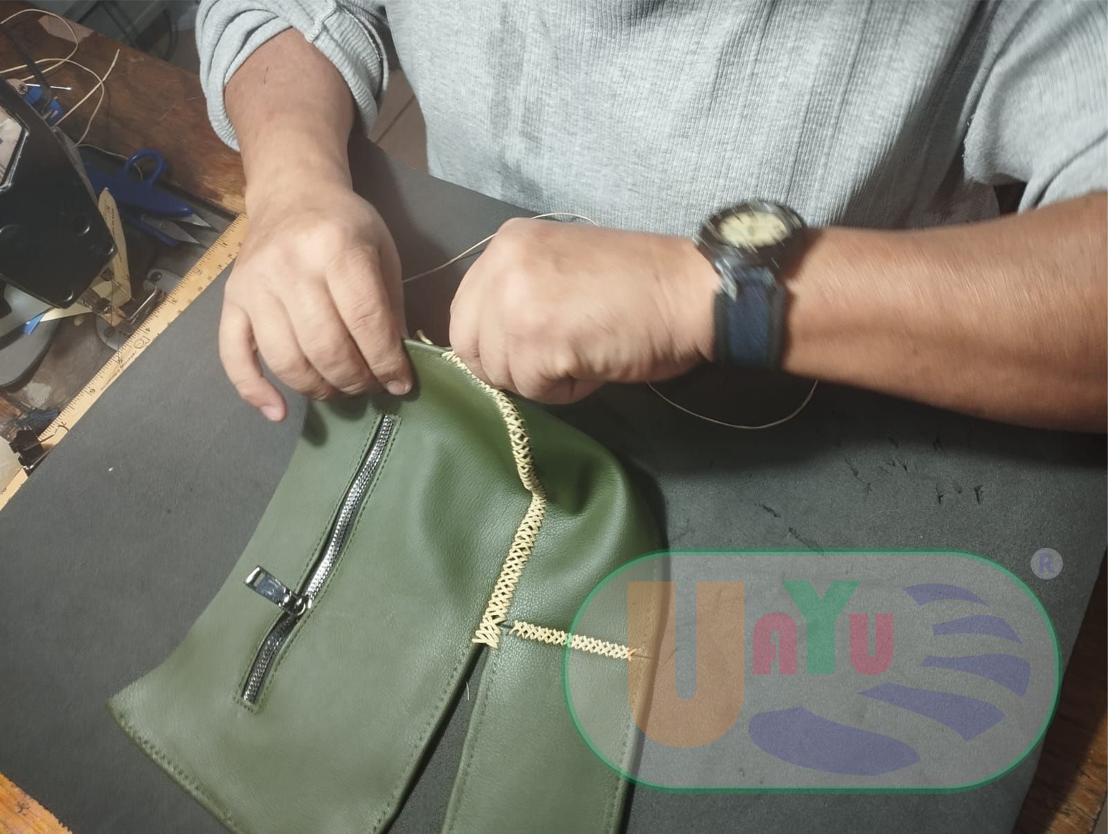 Cada bolso se ensambla mediante técnicas tradicionales de marroquinería, donde la estructura se define a partir de uniones precisas y costuras realizadas a mano. Más de 600 puntadas con hilo encerado consolidan la forma y refuerzan los puntos de tensión, asegurando estabilidad, resistencia y durabilidad en el uso continuo.